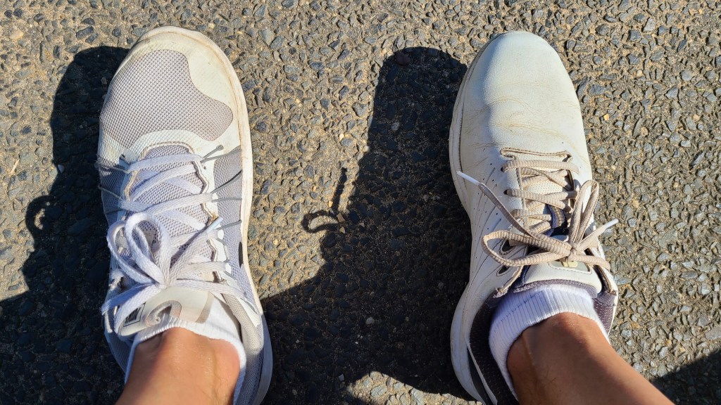 I was only wearing one golf shoe. On my right foot. My left foot still had my sneaker on it. We laughed about it and I rolled my 15-footer to save par. “I might wear one golf shoe all the time!” I joked.