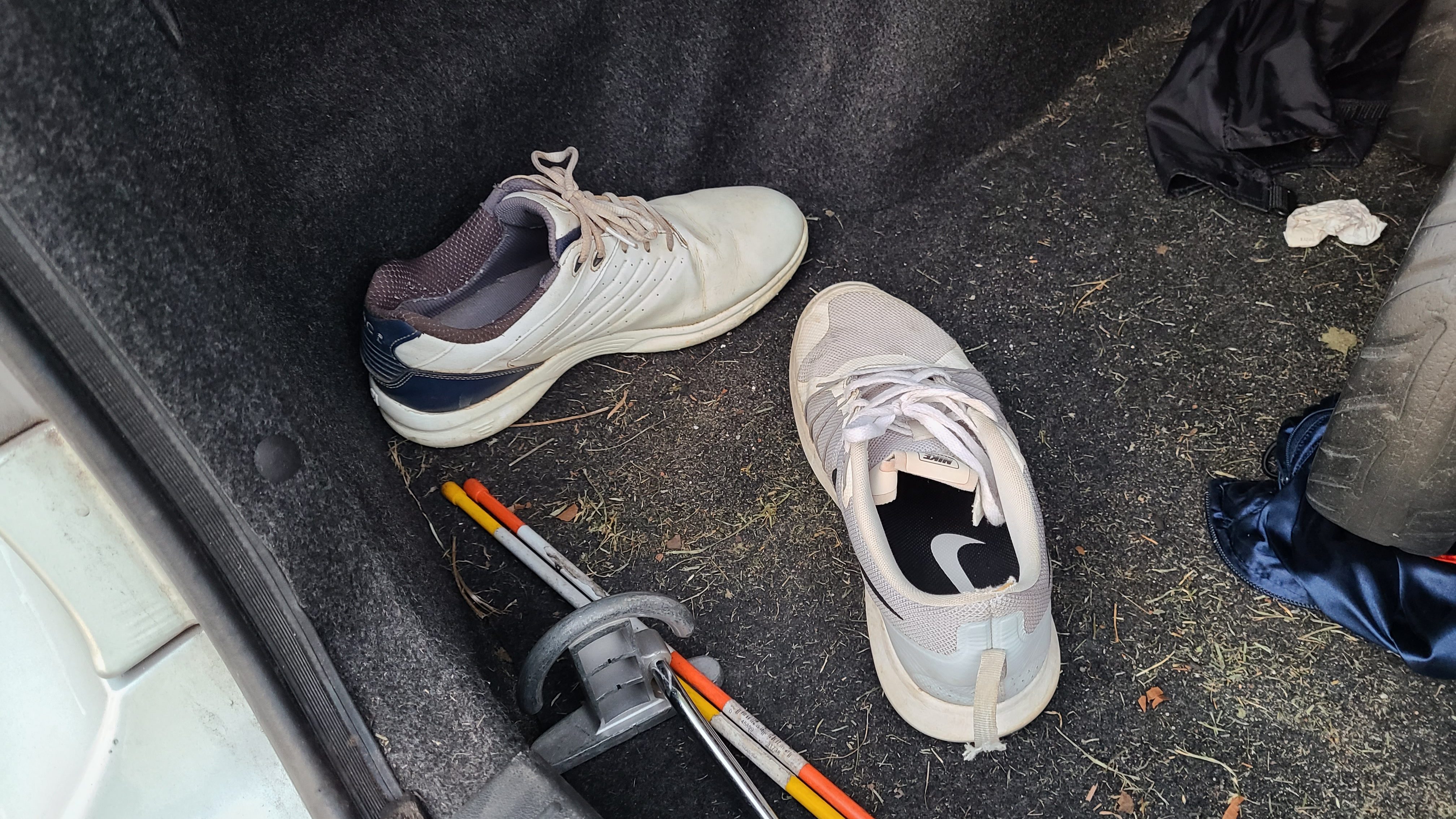 14 green. That dangerous line I was talking about would be coming in from the lower right corner of the photo.Gorgeous, wide green at 15.Looking back at 16 in the fading light. You can just about see the water on the left side of the picture, center of the frame.Pretty sure I snapped this only after we drove back to look for my 4-iron.The par-3 18th.My left golf shoe… right where I left it.