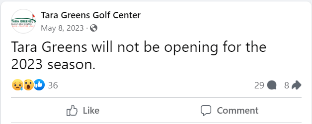 As part of the “golf center” experience of Tara Greens, in addition to the nine-hole course and driving range, the facility also offered a nine-hole pitch-n-putt course. I say “offered” in the past tense, because I recently discovered that in May 2023, Tara Greens announced that it would “not be opening for the 2023 season.”