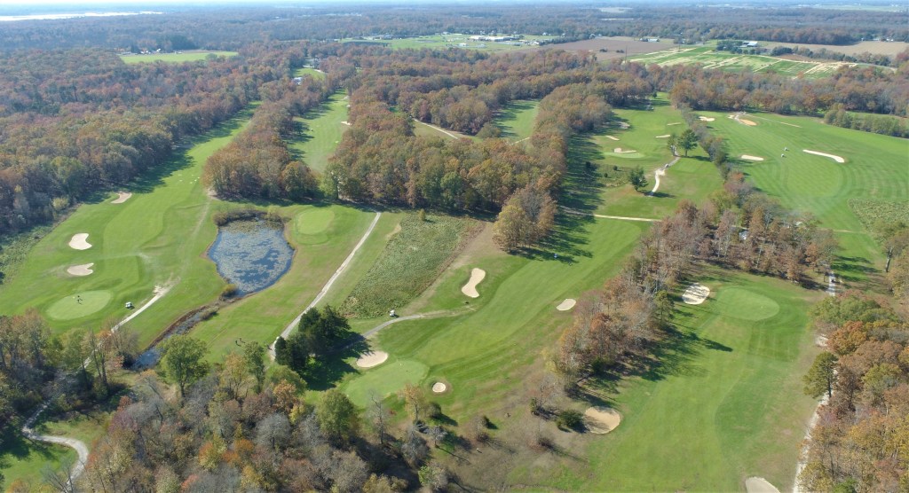 10 – a short par 4 – going out on the left, the par-5 9th – with its massive waste area – coming back on the right, and the remote openness of the farmlands of Salem County in the distance.
